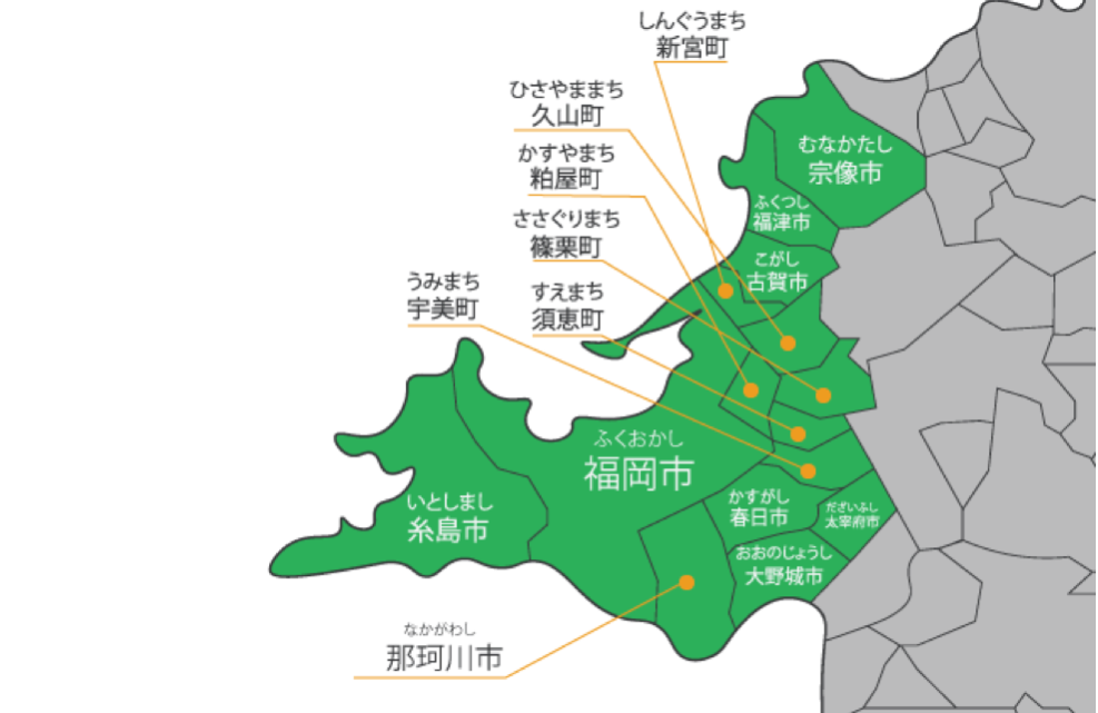 福岡6市全域およびその他の地域(福岡市各区・筑紫野市・太宰府市・春日市・大野城市・那珂川市・糸島市・宗像市・糟屋郡etc)に対応しております。